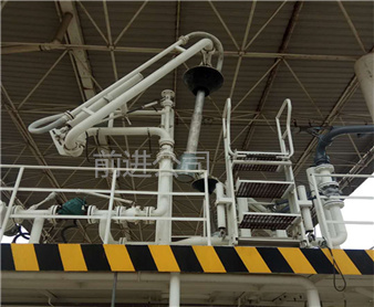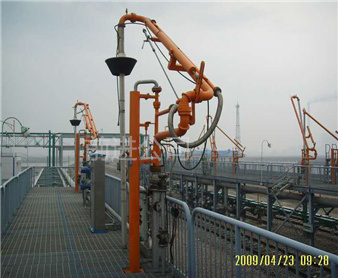 密閉(bì)式頂部裝卸臂由5個旋轉接組成回轉**,液相4個,氣相1個。氣相一般爲DN50,液相根據客戶需要的流量選擇。氣相在轉接處使用金屬軟管連接,保證鶴管的旋轉靈活性。鶴管液相接口朝下,氣相接口朝上,一般氣相會多台彙總在一個主管上,如果單台排空的話,需要加帶雨帽的阻火器,**管道進入點燃源。垂管上有一個錐形密封帽,裝車時垂管插到槽車的頂部灌口,密封帽壓實在灌口處,鎖緊外臂鎖緊杆(或者氣缸壓緊,在和油氣回收配合使用時,建議鶴管增加氣缸,達到充分密閉(bì)的作用,因爲空的槽車在裝車時物料逐漸增多,槽車輪胎壓扁,槽車降低,密封帽就不能很好的密封瞭(le),必須有氣缸對密封帽有一個壓力,才能使密封帽始終跟緊灌口。達到有效密閉(bì)的效果,油氣回收需要密閉(bì)效果達到90%-95%)密封帽密閉(bì)後,槽車裏氣化的介質就能通過鶴管上的氣相管道排空或者抽入油氣回收系統